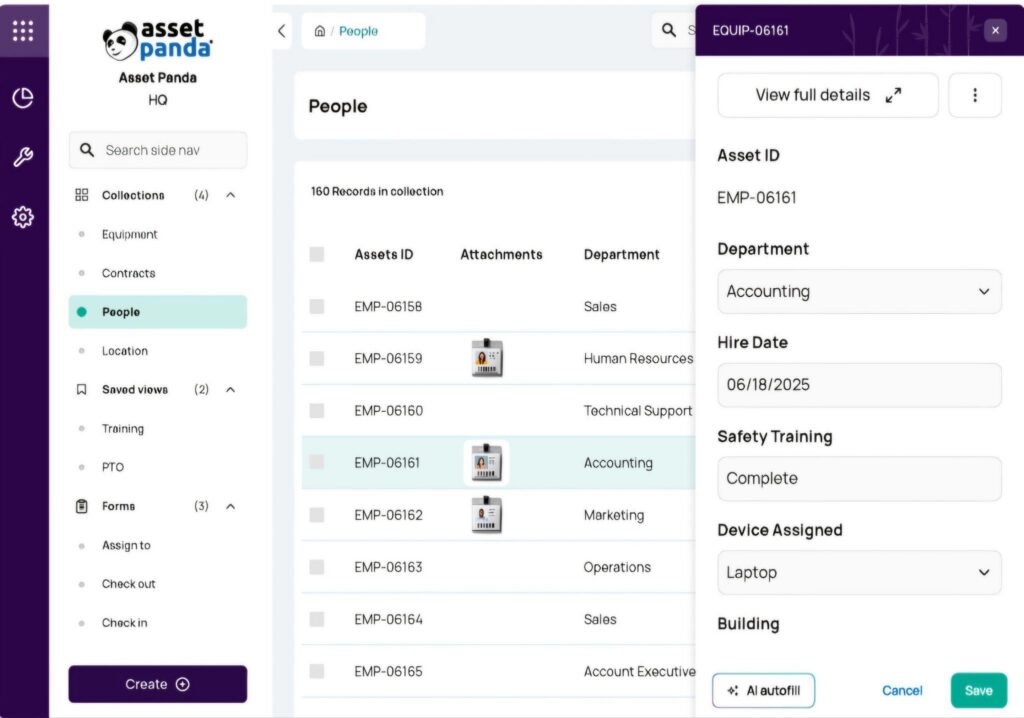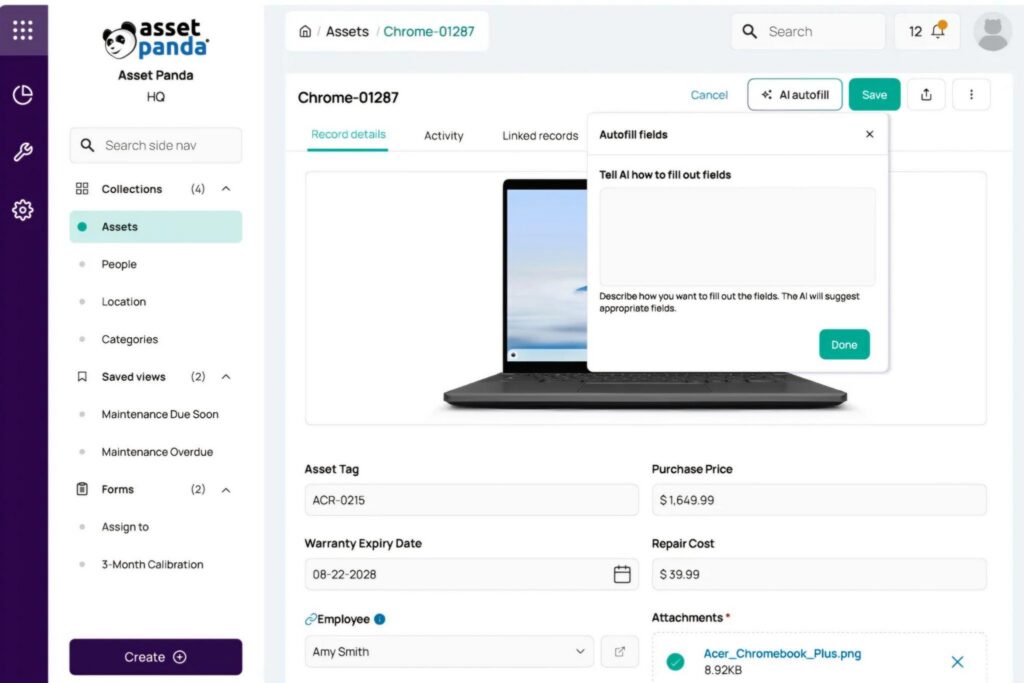 Asset Panda’s Approach: Ursa AI is a built-in AI assistant on the Enterprise plan that supports natural language queries, AI-generated automations, AI column mapping for data imports, field auto-fill, and database configuration suggestions.