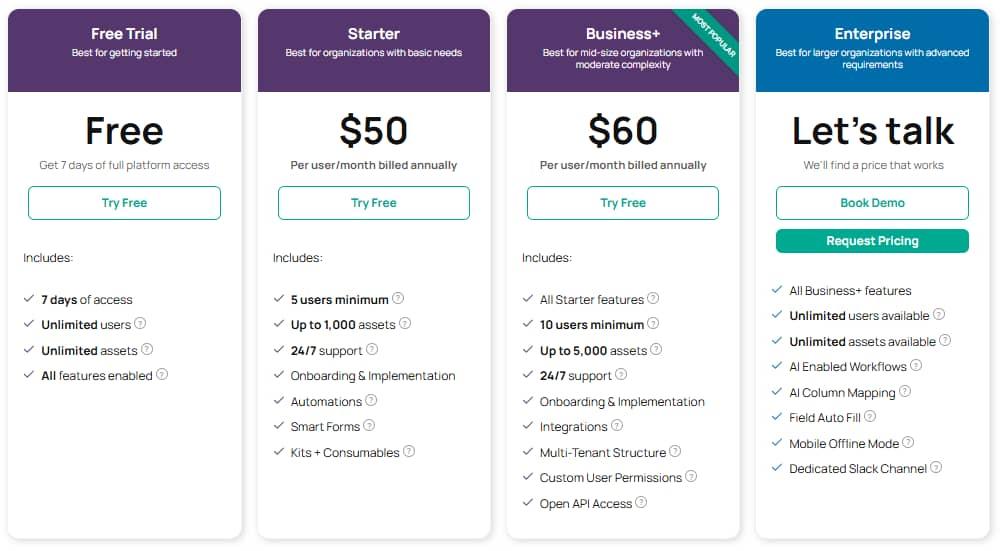 The Starter plan costs $3,000/year for 5 users and 1,000 assets. Additional seats cost $600–$900 per user per year depending on the plan. View-only access for staff who just check assets in and out costs $120 per collaborator per year. Additional asset blocks beyond a plan’s cap run $0.50–$1.00 per asset per year. For a 50-person organization tracking 5,000 assets, annual costs can climb past $30,000.