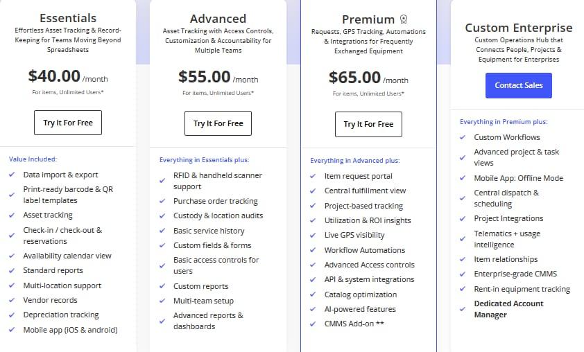 But the feature tiers matter: RFID support requires the Advanced plan ($55/month), and workflow automations, AI features, and API access require Premium ($65/month). The CMMS module is an additional paid add-on even on Premium, with pricing undisclosed.